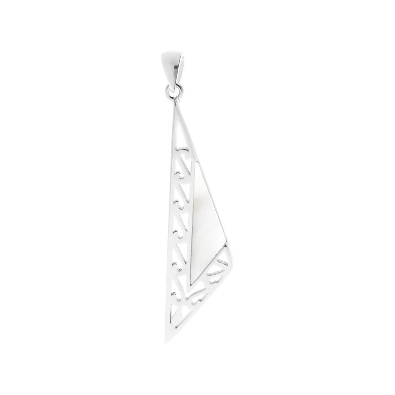 Nowoczesny komplet biżuterii ze srebra próby 925 składa się z kolczyków na zapięcie angielskie oraz wisiorka w tym samym wzorze. Jego charakterystycznym elementem są wydłużone, trójkątne kształty z subtelnymi ażurowymi wycięciami, które nadają całości lekkości i oryginalnego stylu. Centralną część zdobi masa perłowa, pięknie odbijająca światło i tworząca delikatny połysk. Geometryczna forma zestawiona z eleganckim blaskiem masy perłowej sprawia, że komplet łączy w sobie nowoczesność i klasyczną elegancję. Kolczyki są wygodne w noszeniu, a wisiorek świetnie podkreśla dekolt, tworząc spójny zestaw. To idealna propozycja dla kobiet ceniących biżuterię wyrazistą, ale jednocześnie subtelną i pełną wdzięku.