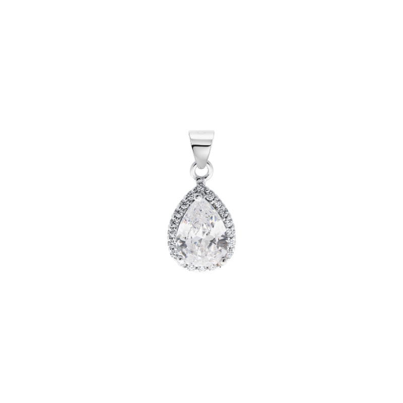 Olśniewający komplet biżuterii wykonany ze srebra próby 925, składający się z kolczyków i zawieszki. Centralnym elementem jest biała cyrkonia o kształcie kropli, otoczona drobniutkimi, połyskującymi cyrkoniami, które tworzą delikatną, świetlistą ramę. Całość zawieszona jest na smukłym, srebrnym pasku, dodając kompozycji lekkości i eleganckiego wydłużenia.
