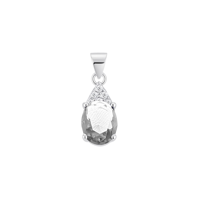 Komplet biżuterii wykonany ze srebra próby 925, składający się z kolczyków i zawieszki. Centralnym elementem jest owalna, szara cyrkonia o eleganckim, lustrzanym połysku. Nad nią znajdują się drobne, białe cyrkonie, które subtelnie rozświetlają kompozycję. Całość zawieszona jest na smukłym, srebrnym pasku, nadając biżuterii lekkości i nowoczesnego charakteru.