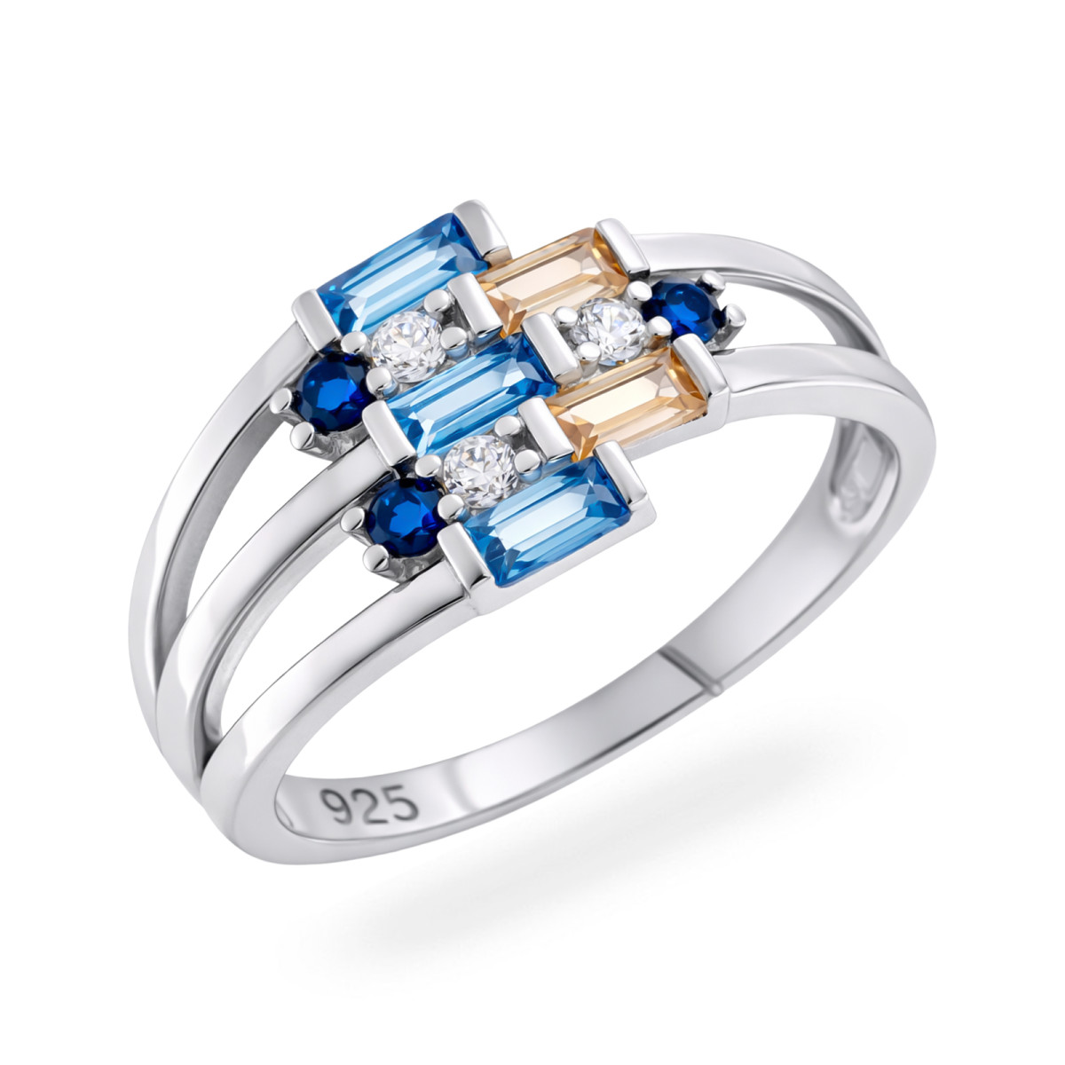 Elegancki pierścionek wykonany ze srebra próby 925 zachwyca nowoczesnym, geometrycznym designem i subtelną grą kolorów. Jego wyjątkową formę tworzy kompozycja prostokątnych kamieni w odcieniach głębokiego błękitu oraz delikatnego szampana, które harmonijnie przeplatają się z okrągłymi, lśniącymi cyrkoniami.