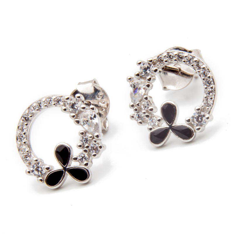 Srebrne kolczyki motyw koła z czarnym kwiatkiem Wykonane z lśniącego srebra próba 925. Fabrycznie nowe.