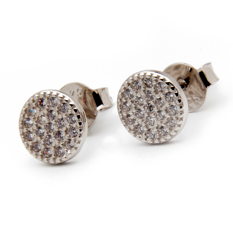 Srebrne kolczyki z motywem koła z białymi cyrkoniami. Wykonane z lśniącego srebra próba 925. Fabrycznie nowe.