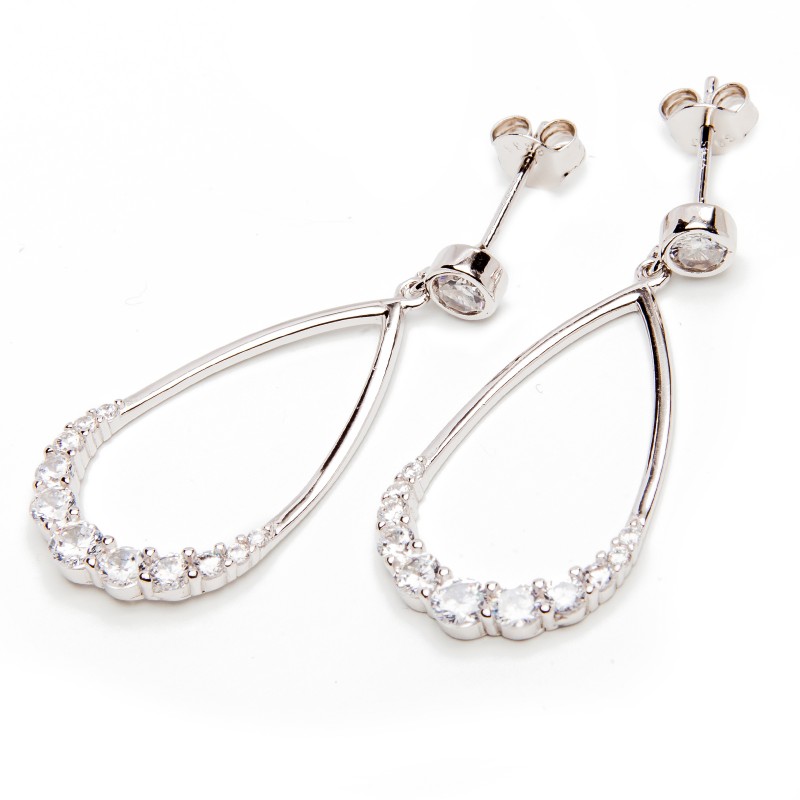 Srebrne kolczyki ze srebrną łezką wypełnioną białymi cyrkoniami. Wykonane z lśniącego srebra próba 925. Fabrycznie nowe.