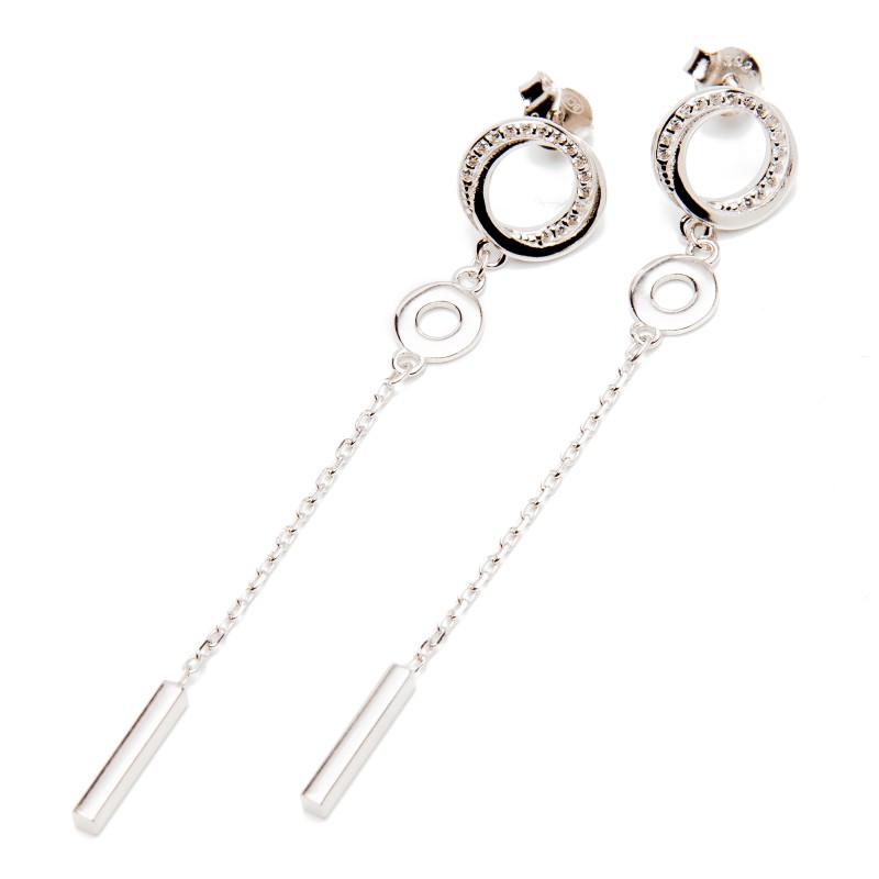 Srebrne kolczyki zdobiony okrąg z cyrkoniami i łańcuszkiem ze srebrną belką na końcu. Wykonane z lśniącego srebra próba 925. Fabrycznie nowe.