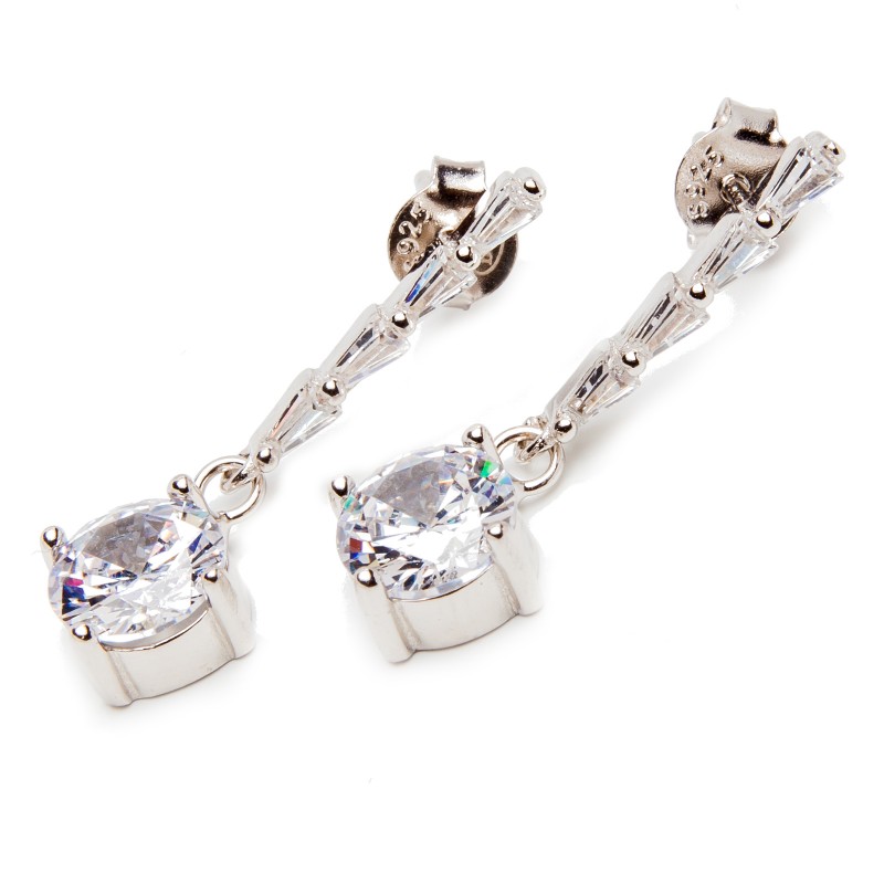 Srebrne kolczyki z dużą, białą cyrkonią zawieszoną na belce. Wykonane z lśniącego srebra próba 925. Fabrycznie nowe.