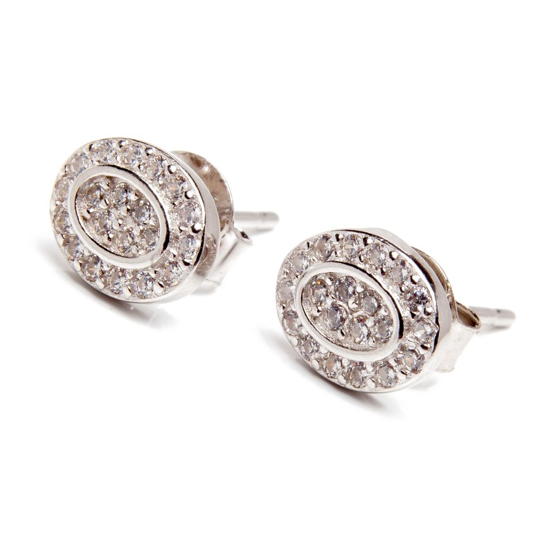 Srebrne kolczyki w kształcie owalu wypełnione białymi cyrkoniami. Wykonane z lśniącego srebra próba 925. Fabrycznie nowe.