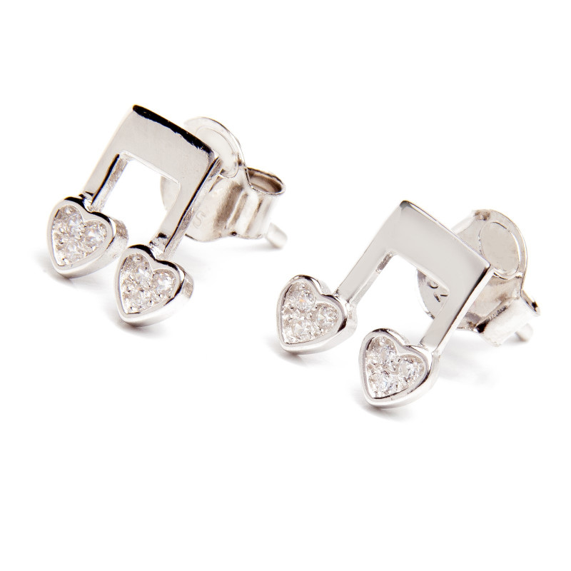 Srebrne kolczyki z cyrkoniami w kształcie nuty i dwoma serduszkami. Wykonane z lśniącego srebra próba 925. Fabrycznie nowe.