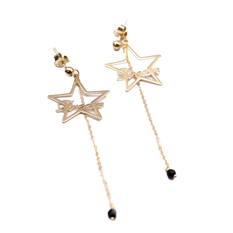 Złote kolczyki z motywem gwiazdy z napisem "Dream" i onyksami zawieszonymi na łańcuszku. Wykonane z lśniącego złota próba 585. Fabrycznie nowe.