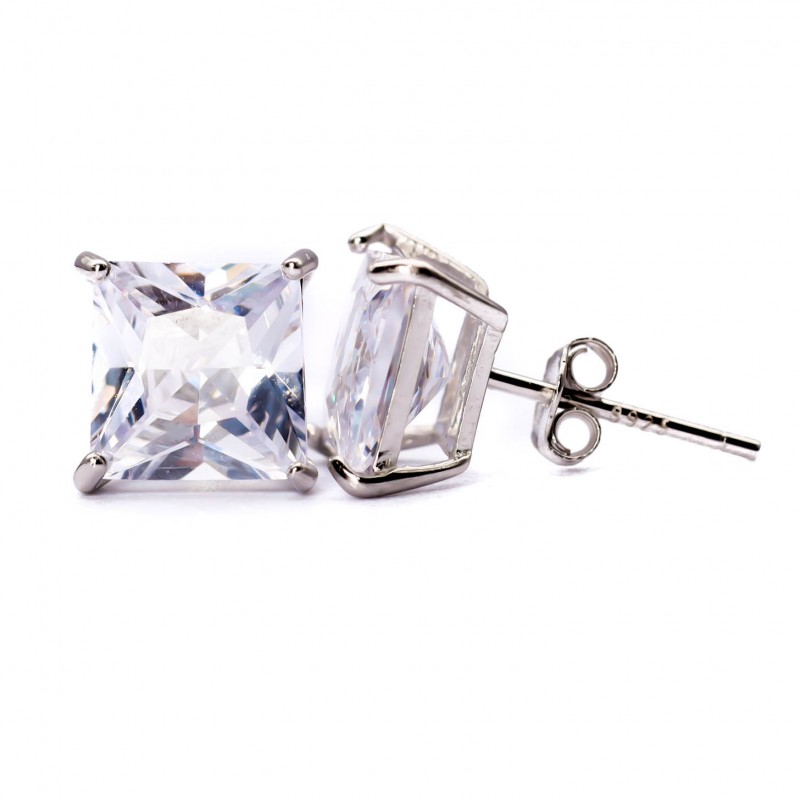 Srebrne kolczyki z dużą kwadratową cyrkonią osadzoną na czterech srebrnych nóżkach. Rozmiar kamienia: 8 mm. Wykonane z lśniącego srebra próba 925. Fabrycznie nowe.