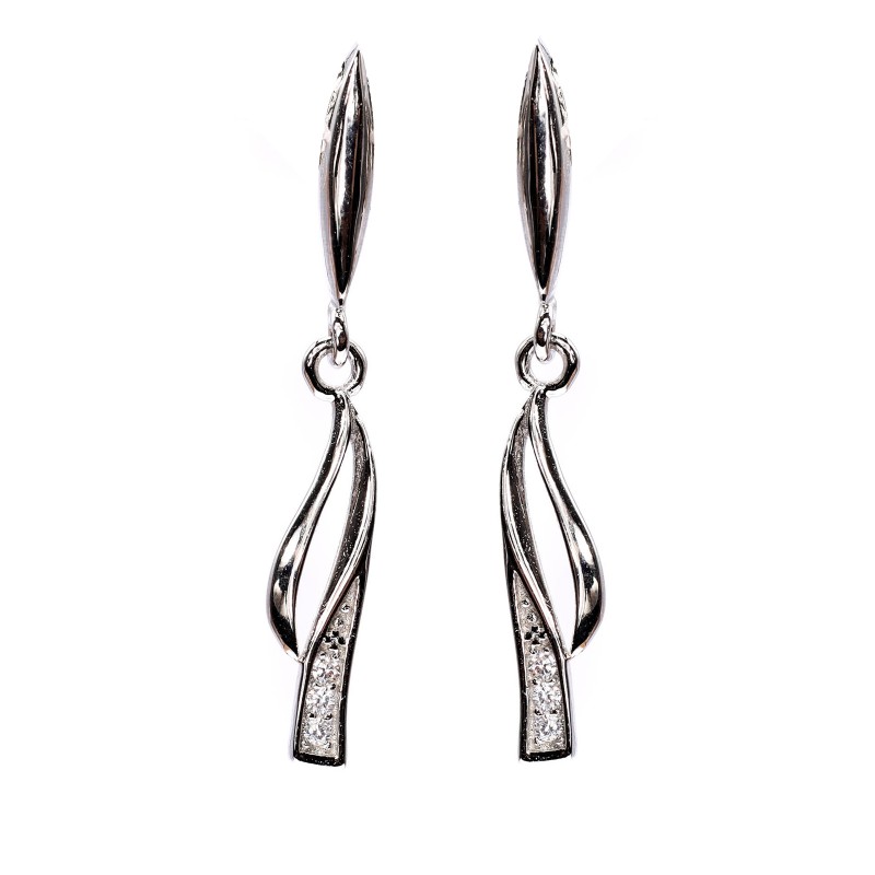 Srebrne kolczyki z wiszącymi wstęgami wyłożonymi białymi cyrkoniami. Wykonane z lśniącego srebra próba 925. Fabrycznie nowe.