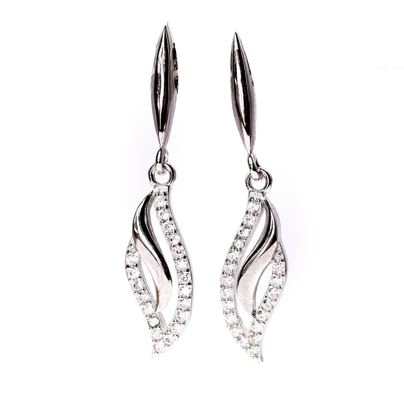 Srebrne kolczyki z wiszącymi wstęgami wyłożonymi białymi cyrkoniami. Wykonane z lśniącego srebra próba 925. Fabrycznie nowe.