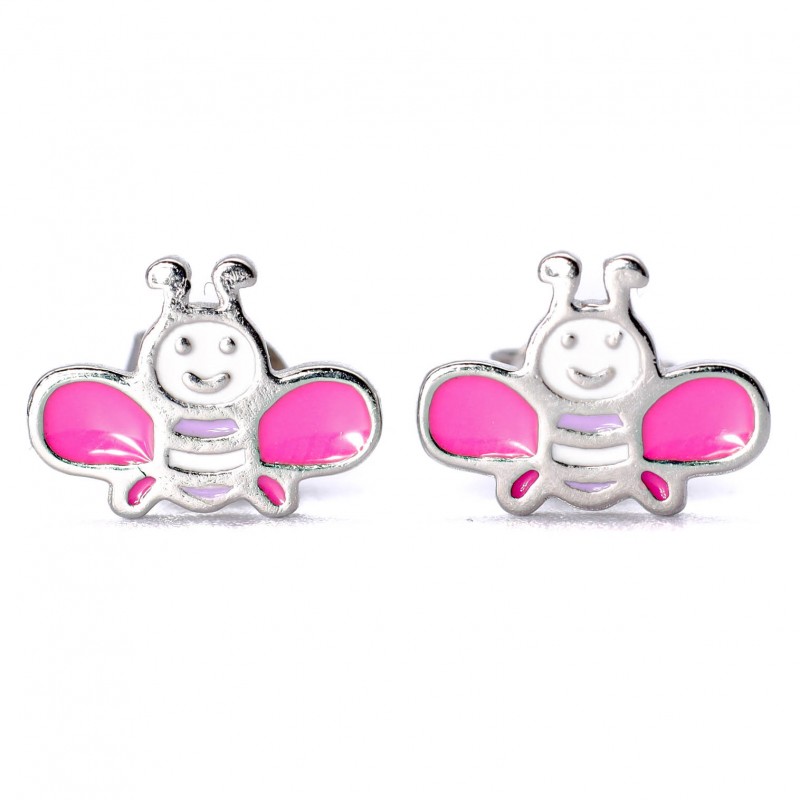 Srebrne kolczyki z motywem uśmiechniętej pszczółki z różowymi skrzydełkami. Idealne dla każdej małej damy. Wykonane z lśniącego srebra próba 925. Fabrycznie nowe.