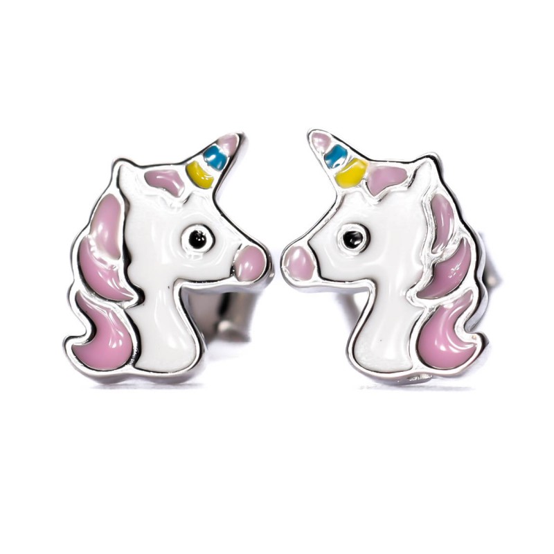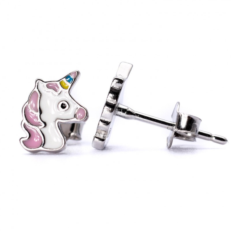 Srebrne kolczyki z motywem białego jednorożca z różową grzywą i tęczowym magicznym rogiem. Idealne dla każdej małej damy. Wykonane z lśniącego srebra próba 925. Fabrycznie nowe.