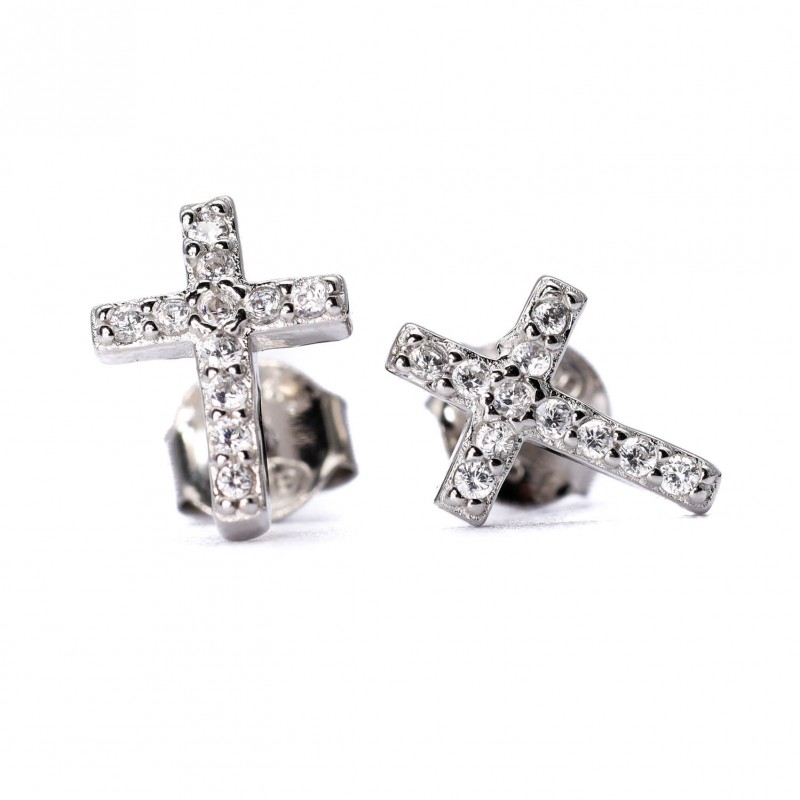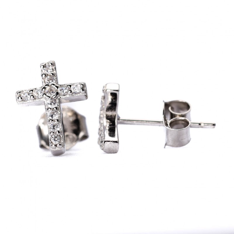 Srebrne kolczyki z motywem krzyżyka wyłożonego białymi cyrkoniami. Wykonane z lśniącego srebra próba 925. Fabrycznie nowe.