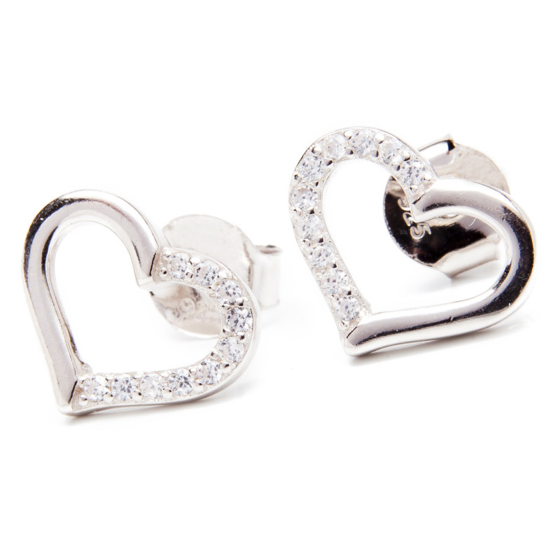 Srebrne kolczyki z motywem serca ozdobionego cyrkoniami. Wykonane z lśniącego srebra próba 925. Fabrycznie nowe.