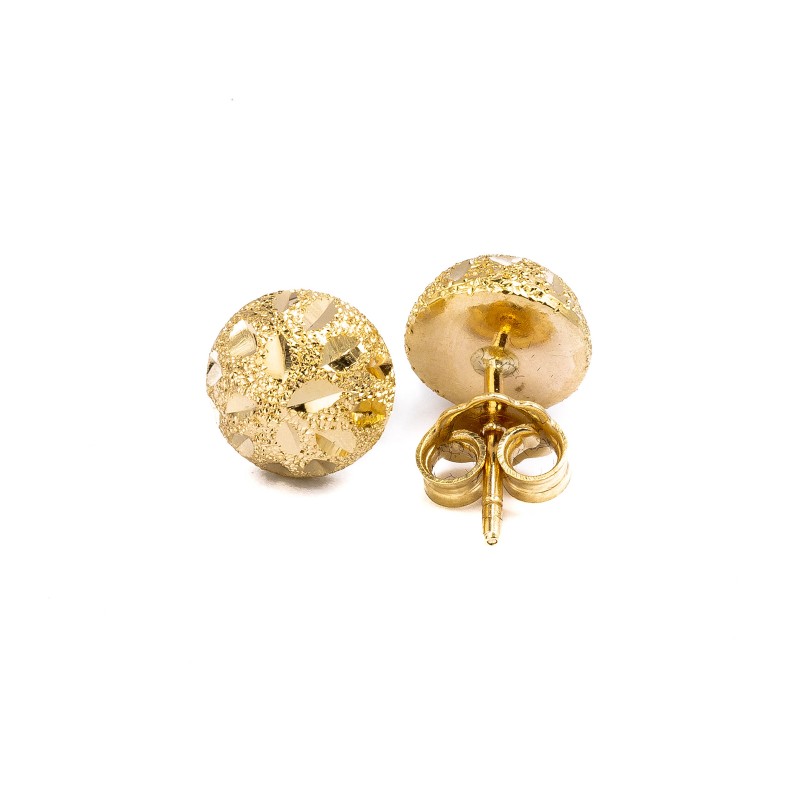 Złote kolczyki w kształcie błyszczących, diamentowanych półkulek. Wykonane z lśniącego złota próba 585. Fabrycznie nowe.