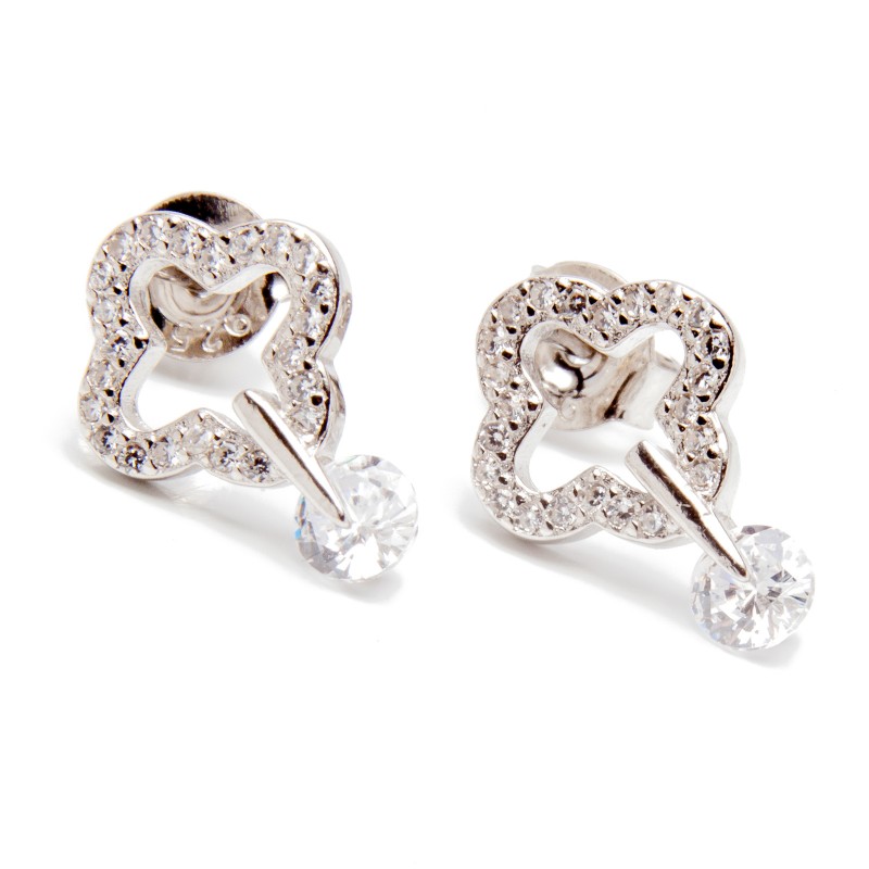 Srebrne kolczyki kwiatek z białymi cyrkoniami. Wykonane z lśniącego srebra próba 925. Fabrycznie nowe.