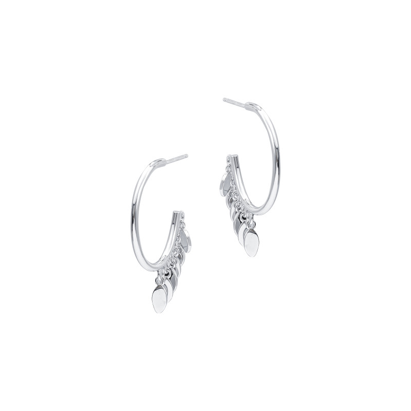 Nowoczesne i stylowe srebrne kolczyki damskie o próbie 925 w formie kół, ozdobione delikatnymi, wiszącymi blaszkami. Ten modny design łączy w sobie prostotę kształtu z subtelną elegancją, tworząc wyjątkowy dodatek, który podkreśli Twój styl i osobowość.