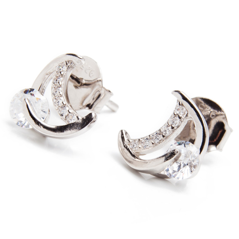 Srebrne kolczyki z motywem półksiężyca z ozdobną cyrkonią. Wykonane z lśniącego srebra próba 925. Fabrycznie nowe.