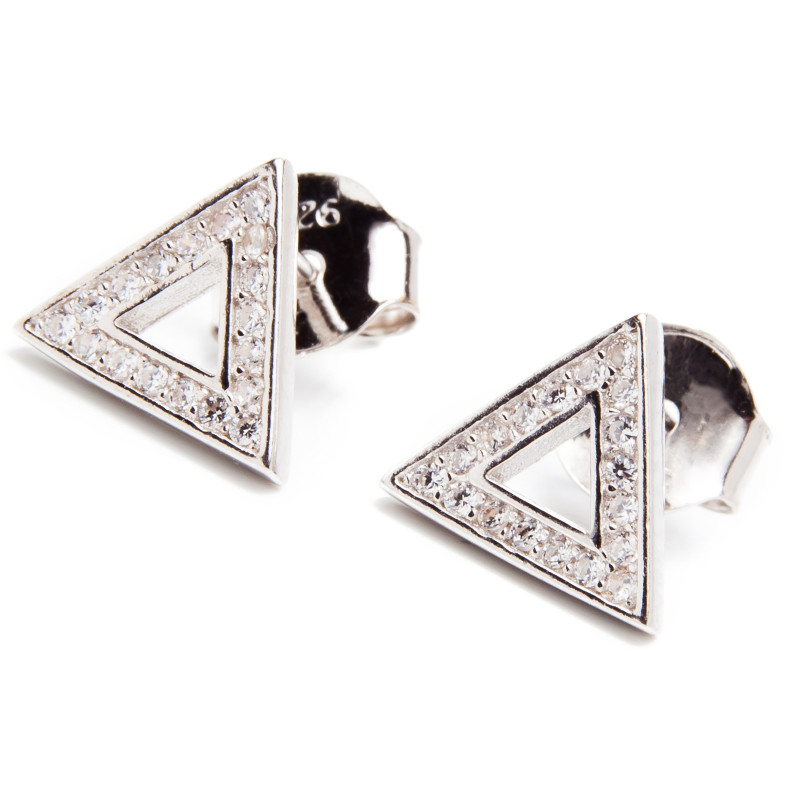Srebrne kolczyki z motywem trójkąta ozdobionego białymi cyrkoniami. Wykonane z lśniącego srebra próba 925. Fabrycznie nowe.