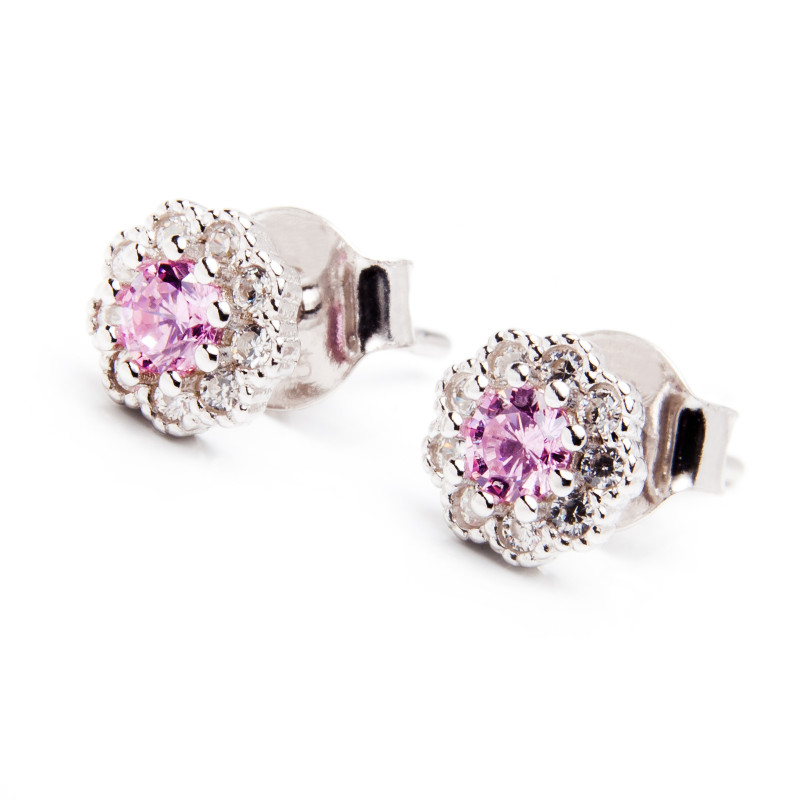 Srebrne kolczyki z różową cyrkonią. Wykonane z lśniącego srebra próba 925. Fabrycznie nowe.