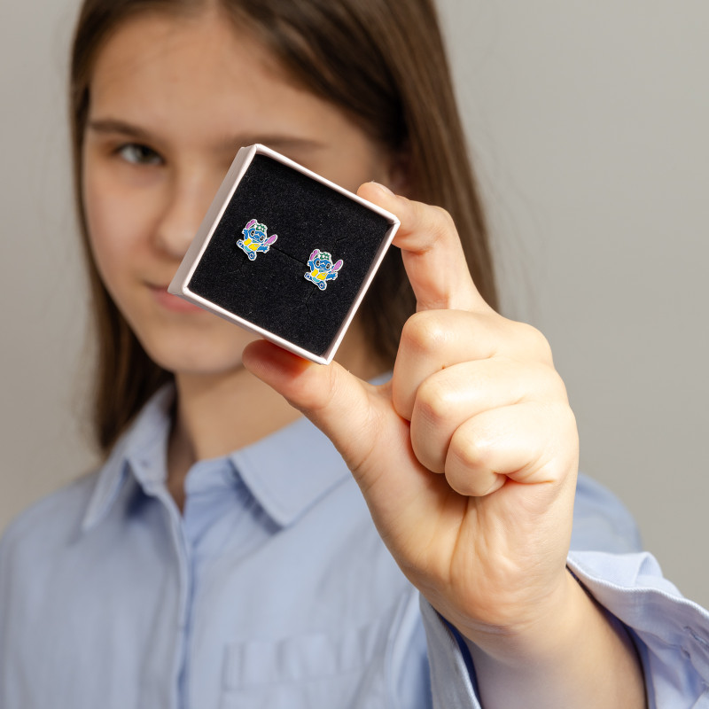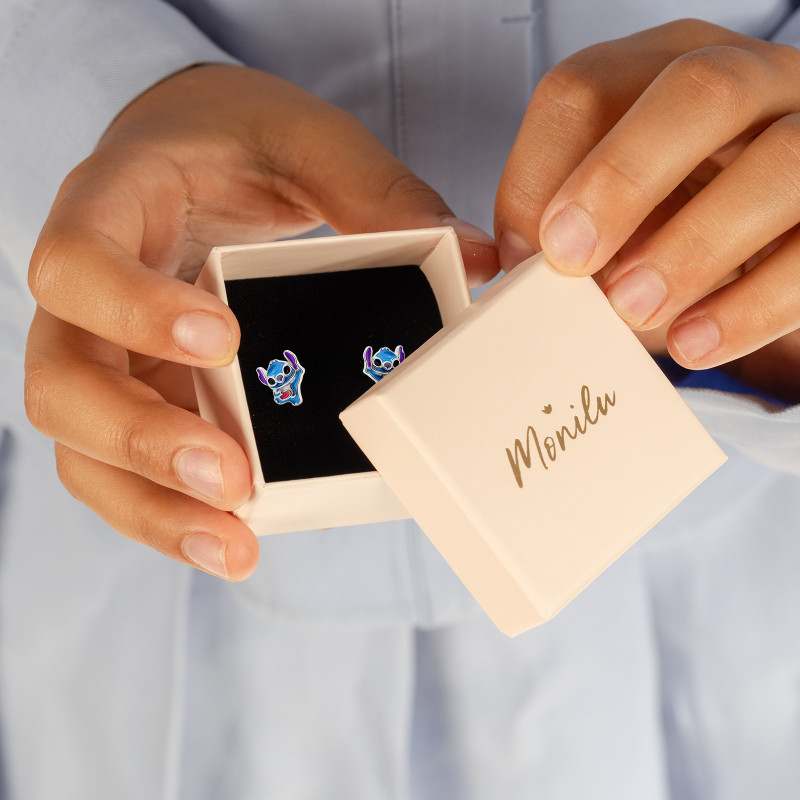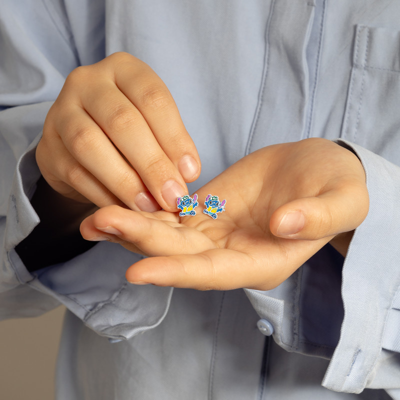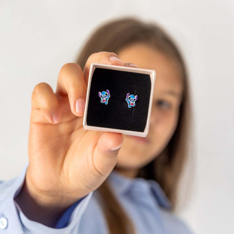 Kolczyki zostały zaprojektowane z dbałością o każdy detal, co pozwala na wierne oddanie charakterystycznego wyglądu Stitcha, z dbałością o detale, takie jak fioletowe uszy, niebieskie ciałko, czy uroczy pyszczek.