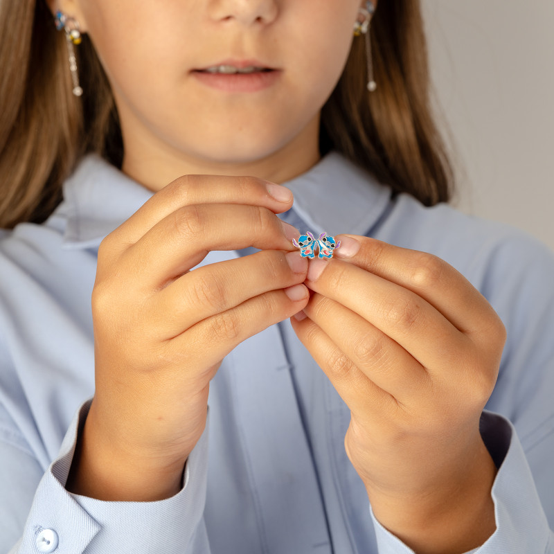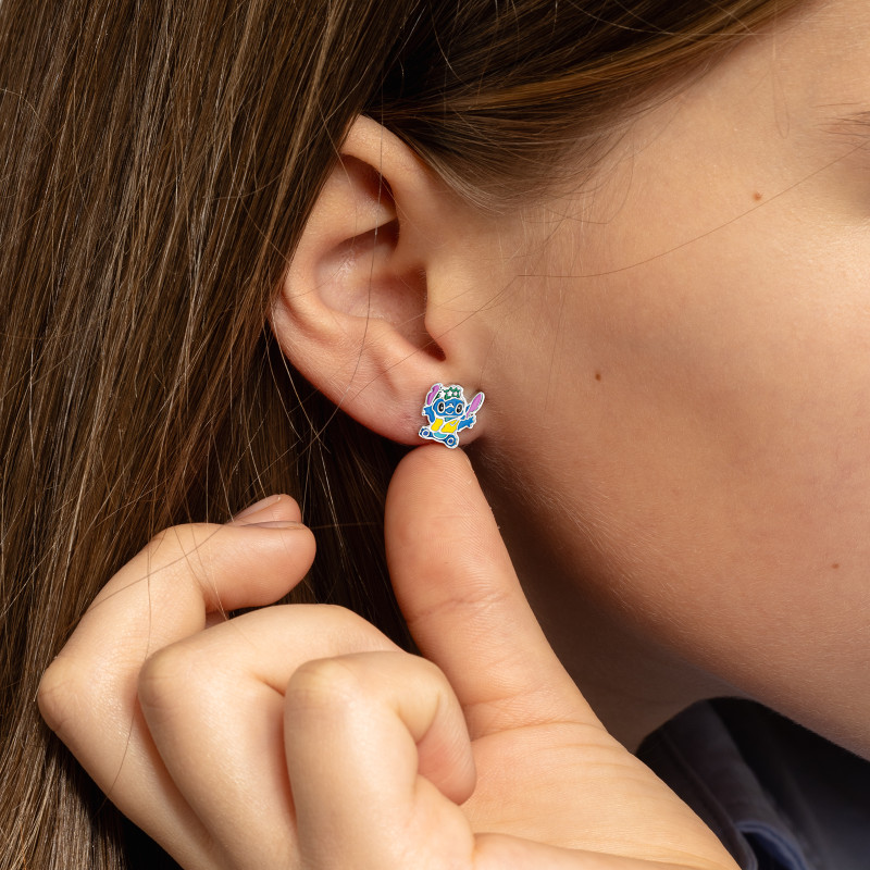Srebrne kolczyki Stich posiadają zapięcie typu sztyft, które gwarantuje bezpieczeństwo i wygodę użytkowania. Dzięki niemu możesz być pewna, że kolczyki pozostaną na uszach Twojej pociechy :)