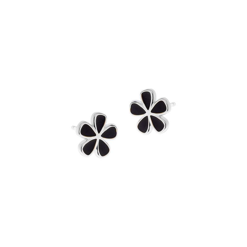 Te stylowe kolczyki na sztyfcie wykonane są ze srebra próby 925 i mają kształt delikatnego kwiatka z pięcioma płatkami. Każdy płatek pokryty jest elegancką, czarną emalią, która kontrastuje z lśniącą, srebrną oprawą, tworząc nowoczesny i wyrazisty efekt. Minimalistyczny, ale efektowny design sprawia, że kolczyki doskonale uzupełnią zarówno codzienne, jak i bardziej eleganckie stylizacje. Czarna emalia nadaje biżuterii głębi i charakteru, podkreślając jej unikalny styl. Zapięcie na sztyft zapewnia komfort noszenia i stabilność. To idealny wybór dla osób ceniących klasykę z odrobiną nowoczesnego wyrazu.