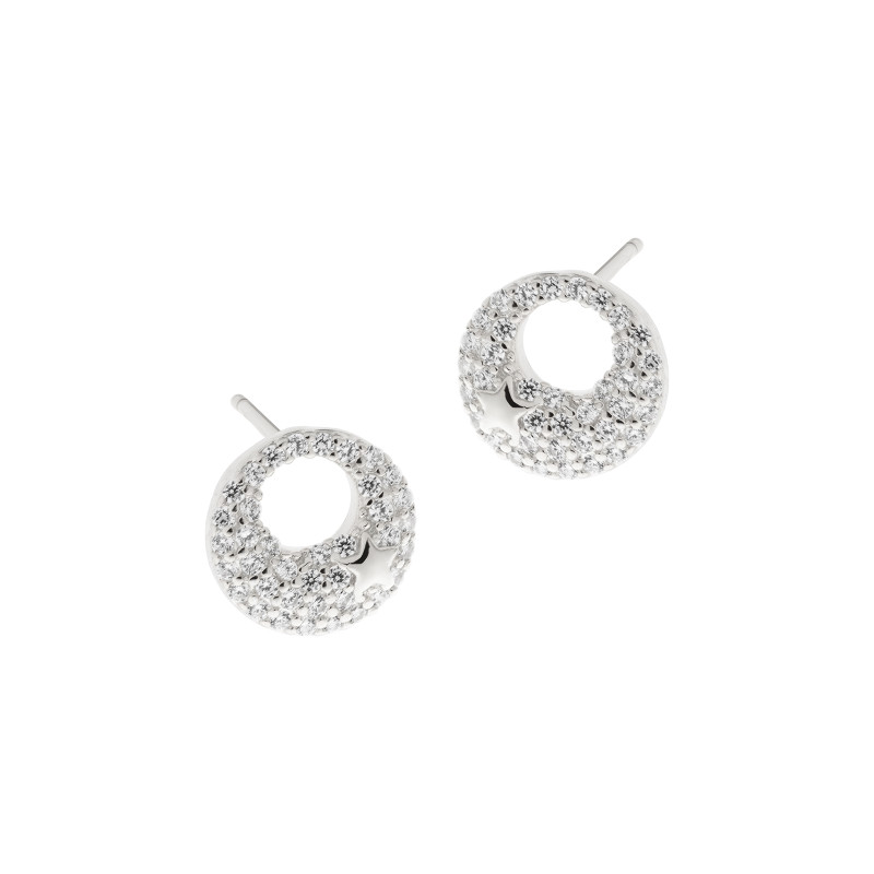 Te eleganckie kolczyki na sztyfcie wykonane są ze srebra próby 925 i mają formę okręgu wysadzanego drobnymi, lśniącymi cyrkoniami. Wśród mieniących się kamieni umieszczona jest delikatna, gładka gwiazdka, która subtelnie wyróżnia się na tle błyszczącego koła. Kontrast pomiędzy blaskiem cyrkonii a prostotą gwiazdki nadaje kolczykom nowoczesny, a zarazem romantyczny charakter. Całość tworzy lekką i kobiecą kompozycję, idealną zarówno na co dzień, jak i na wyjątkowe okazje. Zapięcie na sztyft zapewnia wygodę i pewność noszenia. To doskonały wybór dla osób ceniących delikatną, ale efektowną biżuterię z symboliką marzeń i światła.
