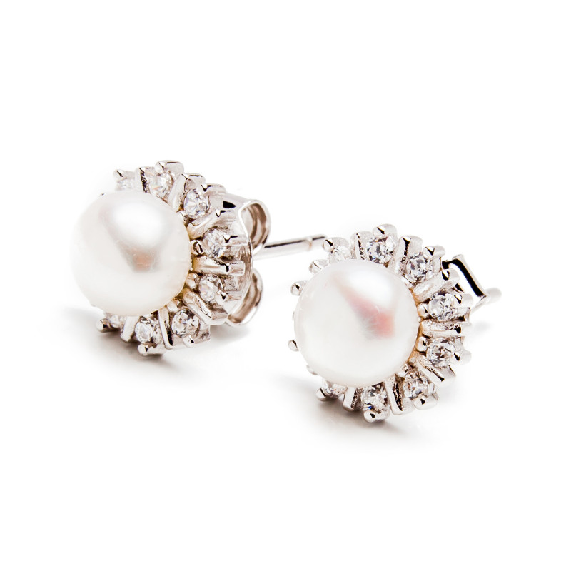 Srebrne kolczyki z białą perłą otoczoną białymi cyrkoniami. Wykonane z lśniącego srebra próba 925. Fabrycznie nowe.