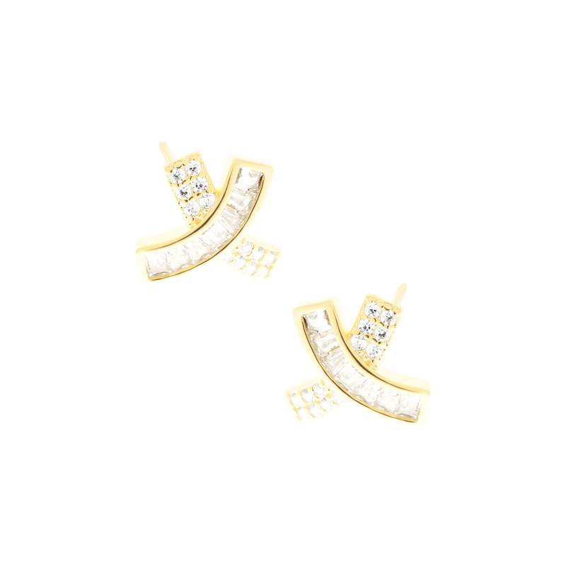 Te eleganckie kolczyki mają formę dwóch przecinających się pasków, tworzących efekt przypominający subtelną, złocistą wstążkę. Jeden pasek wypełniony jest drobnymi, „piaskowanymi” cyrkoniami, a drugi ozdobiony cyrkoniami ciętymi w delikatne paski, co nadaje biżuterii ciekawą fakturę i efektowny blask. Wykonane ze srebra próby 925 i pokryte warstwą złota, łączą trwałość z luksusowym, złocistym połyskiem. Nowoczesny, a zarazem elegancki design sprawia, że kolczyki pasują zarówno do codziennych, jak i wieczorowych stylizacji. Lekka konstrukcja zapewnia wygodę noszenia przez cały dzień. To wyjątkowy dodatek, idealny również jako elegancki prezent.