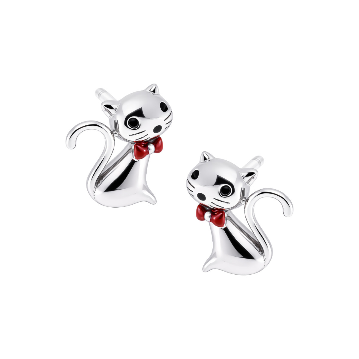 Srebrne kolczyki 925 Lśniący Kotek z czerwoną muszką dla małej damy