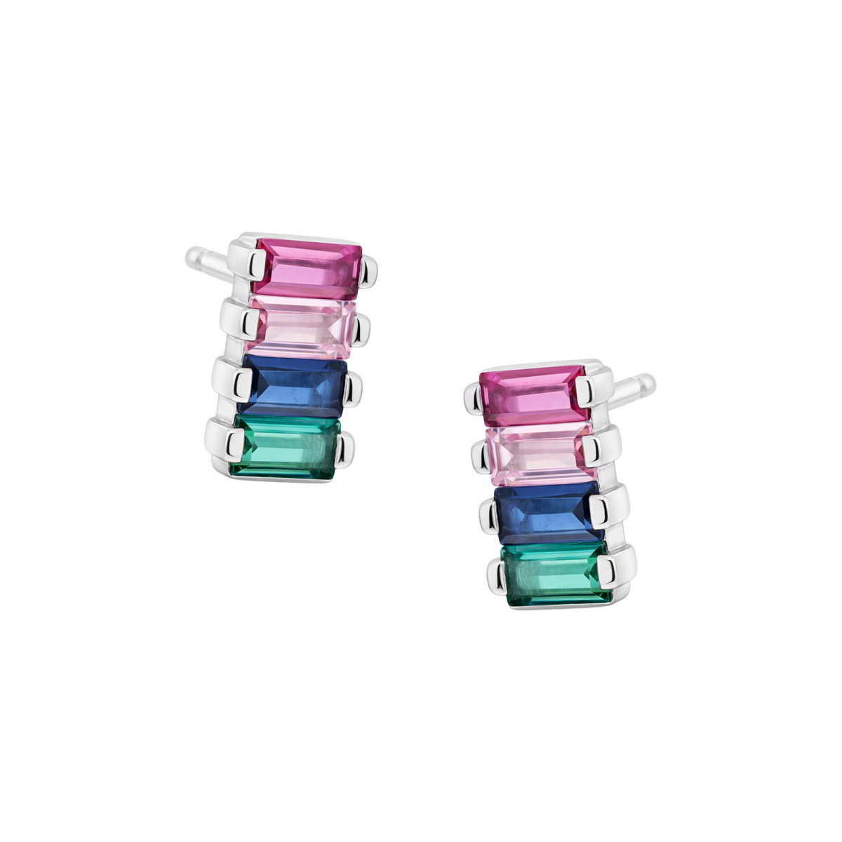 Nowoczesne kolczyki sztyft wykonane ze srebra próby 925, ozdobione efektownymi, prostokątnymi cyrkoniami w różnych kolorach. Geometryczna forma i wielobarwne kamienie tworzą wyjątkową, przyciągającą wzrok kompozycję.