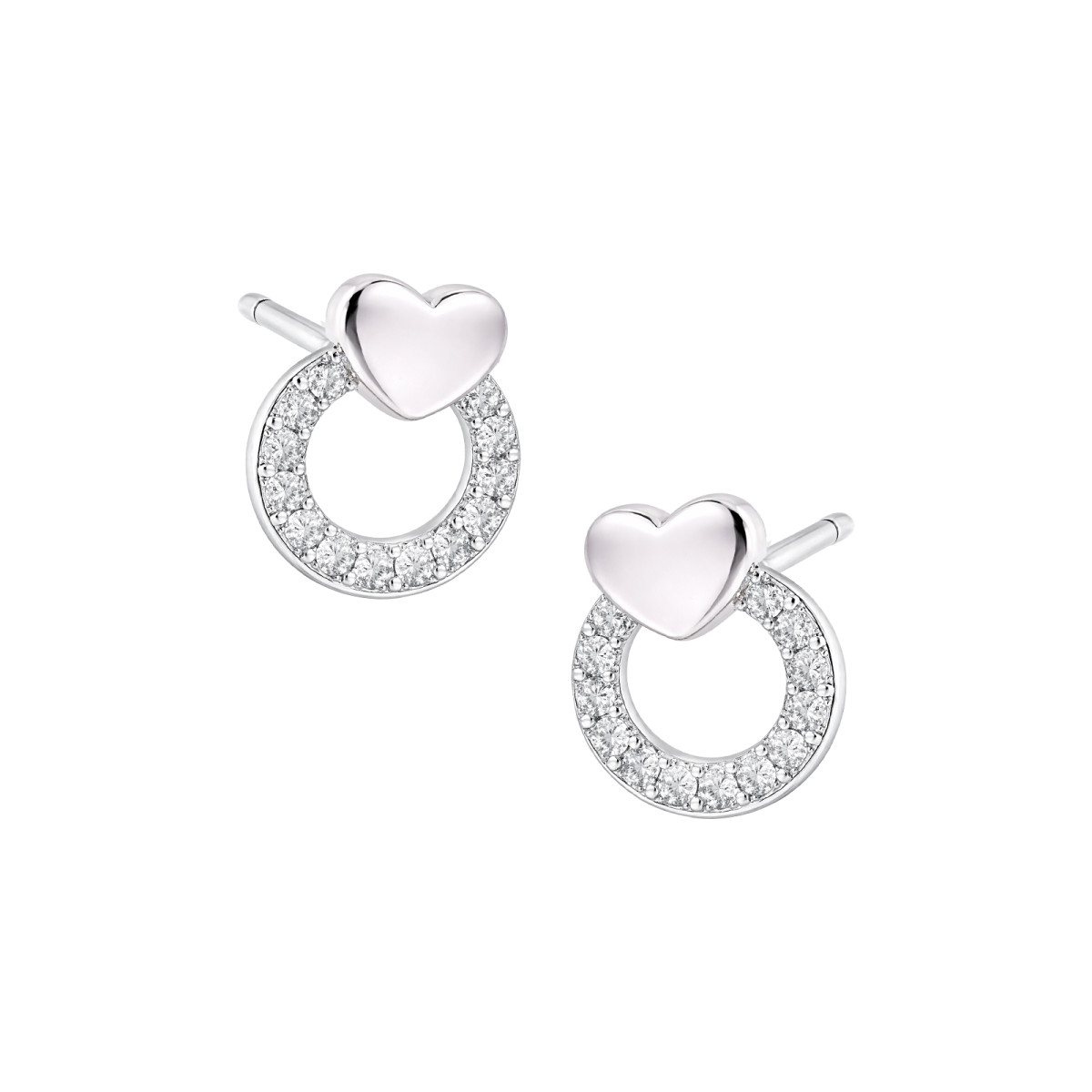 Delikatne kolczyki sztyft wykonane ze srebra próby 925 z subtelnym motywem serca połączonego z eleganckim okręgiem zdobionym lśniącymi białymi cyrkoniami. Harmonijne połączenie gładkiej formy i połyskujących kamieni nadaje im wyjątkowego uroku.