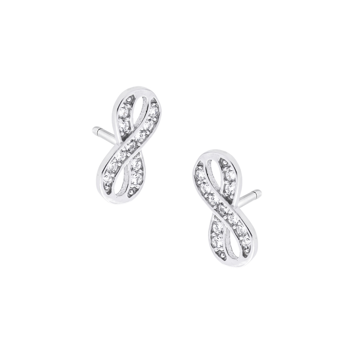 Delikatne kolczyki sztyft wykonane ze srebra próby 925 z motywem nieskończoności, którego linie zostały ozdobione lśniącymi białymi cyrkoniami. Subtelne połączenie gładkiej powierzchni i połyskujących kamieni nadaje im elegancji i wyjątkowego uroku.