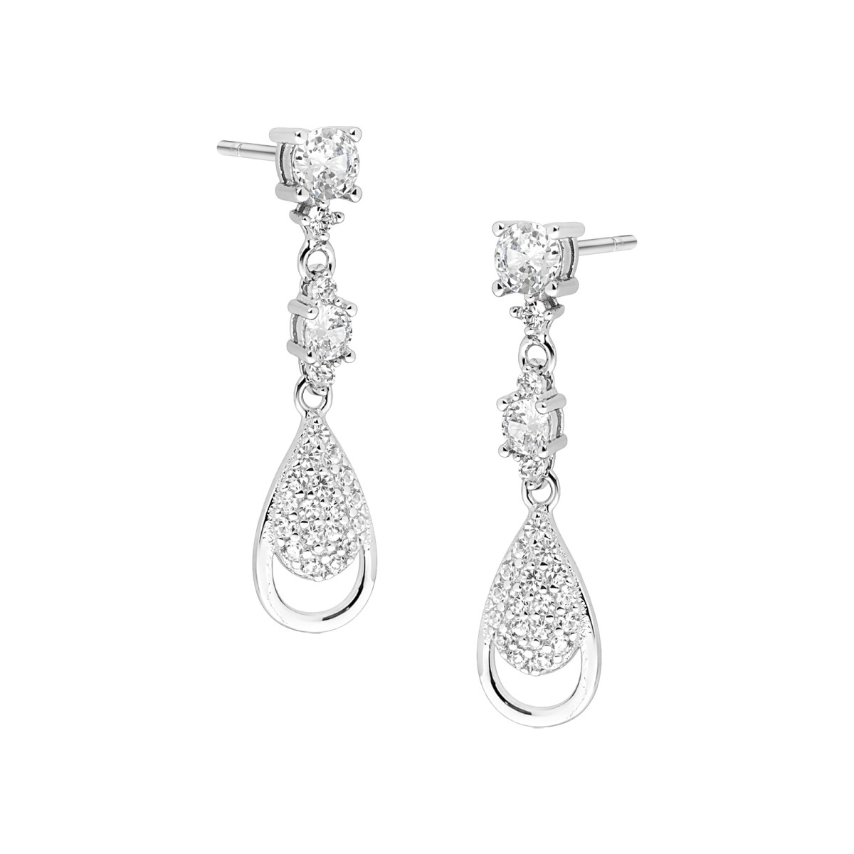 Eleganckie kolczyki srebrne próby 925 na klasycznym sztyfcie, zachwycające subtelną, wiszącą formą. Górną część zdobią lśniące białe cyrkonie, które płynnie przechodzą w efektowny motyw ażurowej łezki, wysadzanej drobnymi kamieniami.