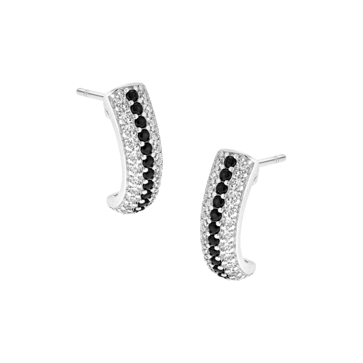 Eleganckie kolczyki srebrne próby 925 na sztyfcie, w formie efektownie zawiniętej blaszki, ozdobionej rzędami lśniących białych cyrkonii oraz kontrastowym pasem czarnych kamieni biegnącym przez środek. Połączenie połysku srebra z subtelnym blaskiem cyrkonii nadaje biżuterii wyrazisty, nowoczesny charakter. To wyjątkowy model, który doskonale podkreśla eleganckie i wieczorowe stylizacje, dodając im szyku i ponadczasowej klasy.