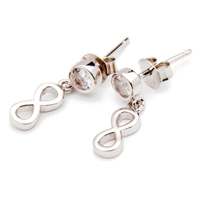 Srebrne kolczyki z motywem nieskończoności i białą cyrkonią. Wykonane z lśniącego srebra próba 925. Fabrycznie nowe.