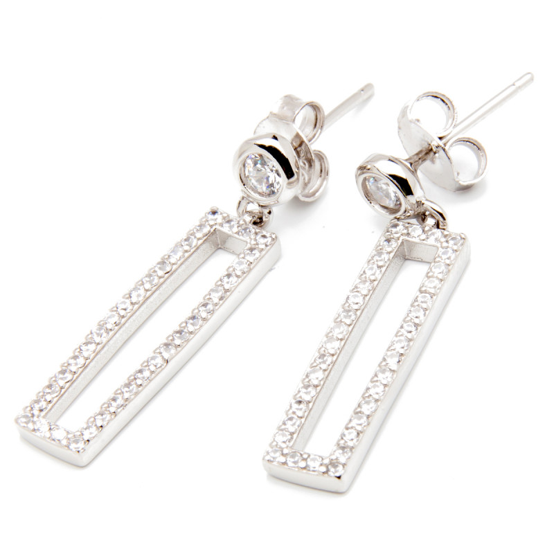 Srebrne kolczyki z prostokątem zdobionym białymi cyrkoniami. Wykonane z lśniącego srebra próba 925. Fabrycznie nowe.