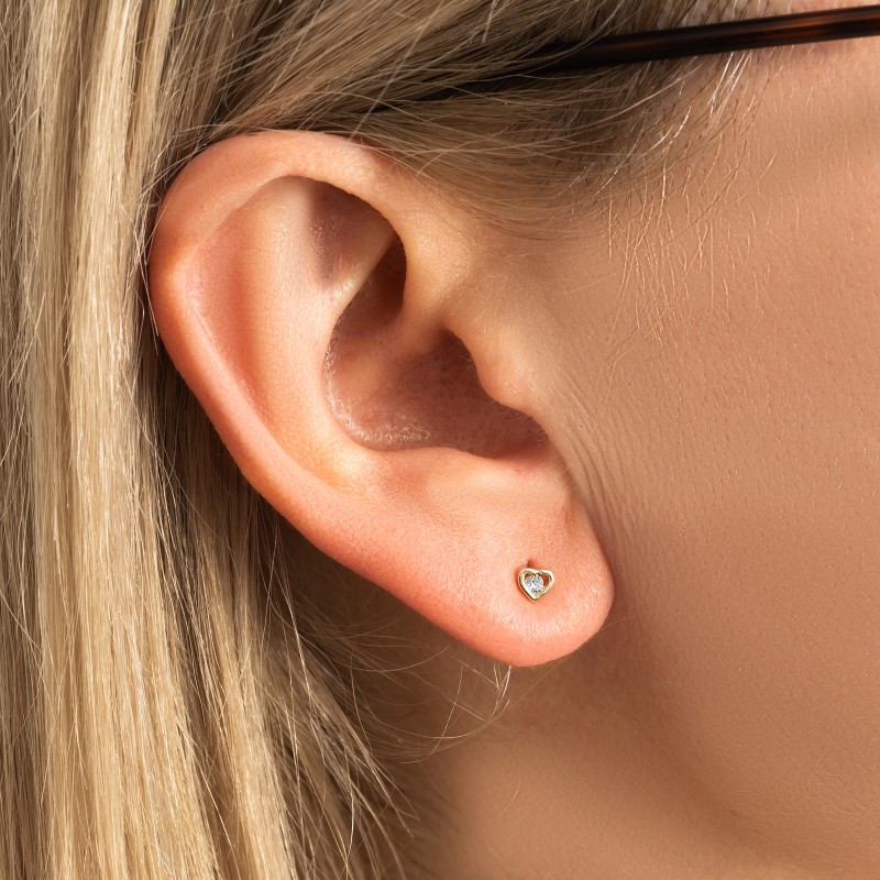 Złote kolczyki z motywem serca z białą cyrkonią. Wykonane z lśniącego złota próba 585. Fabrycznie nowe.