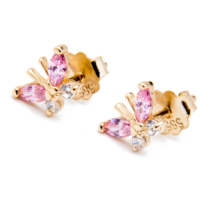 Złote kolczyki z motywem motyla udekorowanego białymi i różowymi cyrkoniami. Wykonane z lśniącego złota próba 585. Fabrycznie nowe.