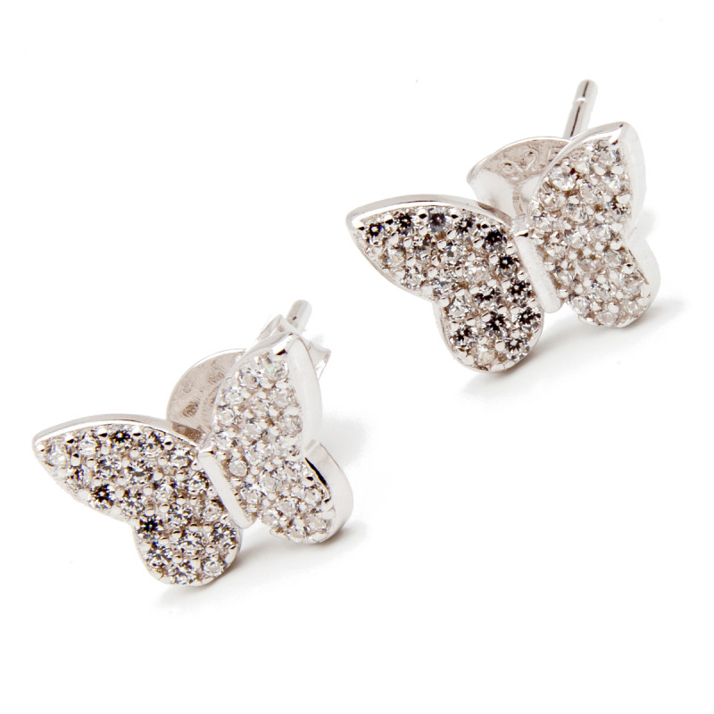 Srebrne kolczyki z motywem motyla z białymi cyrkoniami. Wykonane z lśniącego srebra próba 925. Fabrycznie nowe.