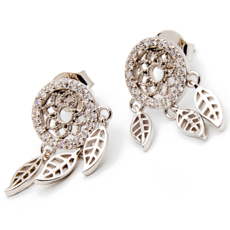 Srebrne kolczyki z motywem łapacza snów z białymi cyrkoniami. Wykonane z lśniącego srebra próba 925. Fabrycznie nowe.